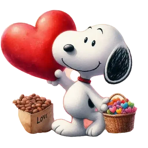 Snoopy, o cachorro do Peanuts, segura um grande coração vermelho e está ao lado de uma caixa de ração com a palavra 'Love' e uma cesta de ovos de Páscoa coloridos.