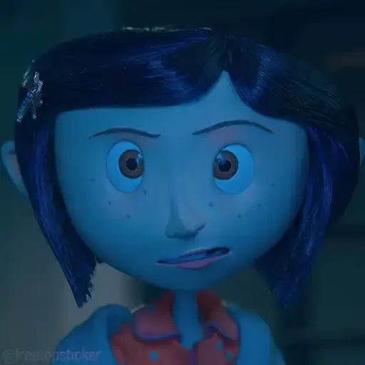 Personagem de filme de animação com expressão surpresa, cabelo azul curto e olhos arregalados.