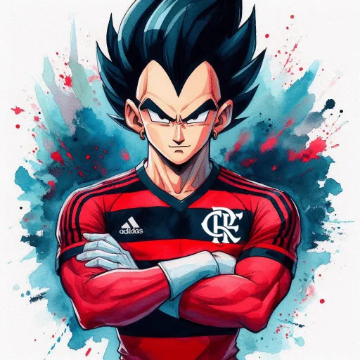 Personagem de anime com cabelo preto espetado e olhos severos, vestindo uma camisa de futebol vermelha com listras pretas e logotipo do Corinthians, com braços cruzados.