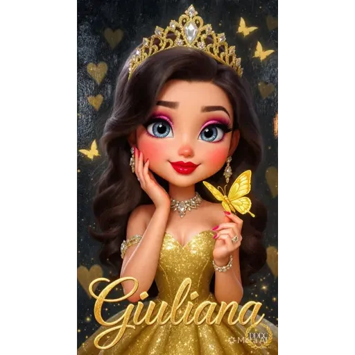Uma princesa de olhos azuis e cabelo castanho, vestida de ouro, com uma coroa na cabeça e um nome 'Giuliana' em letras douradas.