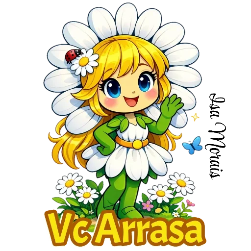 Uma menina de anime com cabelo loiro e olhos azuis, vestida com um traje verde e branco de flor, com a frase 'Vc Arrasa' embaixo.