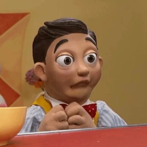 Personagem de desenho animado com olhos grandes e arregalados, mãos ao lado da cabeça, parecendo surpreso ou confuso,…