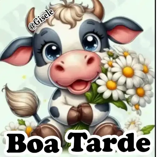 Um bezerro cartoon com manchas pretas e brancas, olhos azuis grandes e um focinho rosa, segurando um buquê de flores brancas com centros amarelos e usando um laço marrom. Abaixo dele está escrito 'Boa Tarde'.