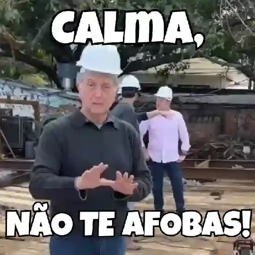 Homem de meia-idade com capacete de segurança e camisa cinza, falando com as mãos, com a frase 'CALMA, NÃO TE AFOBAS!' em destaque. Fundo com outros homens e árvores.