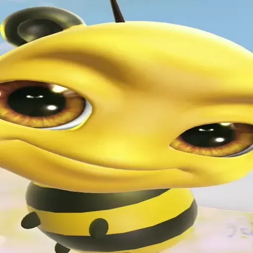 Abelha amarela com olhos grandes e expressão facial fofa, com listras pretas no corpo.
