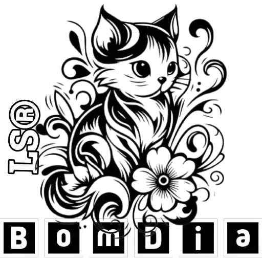 Um gato com detalhes florais e a frase 'Bom dia' escrito embaixo.