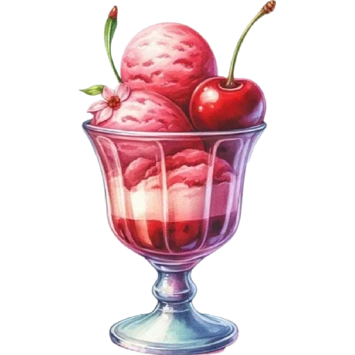 Uma taça de sorvete rosa com duas bolas e cerejas vermelhas.