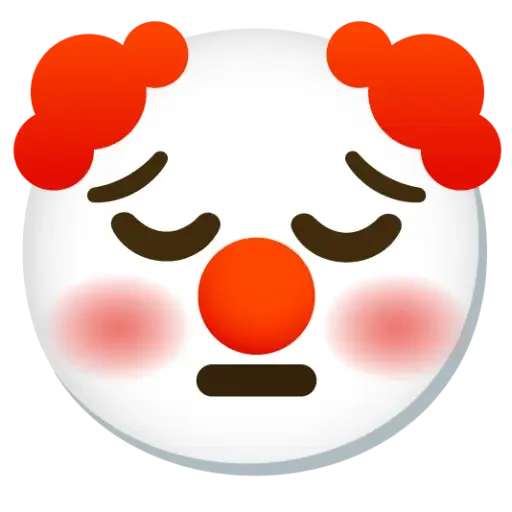 Rosto de palhaço com expressão triste, sobrancelhas para baixo, nariz vermelho e bochechas rosadas.