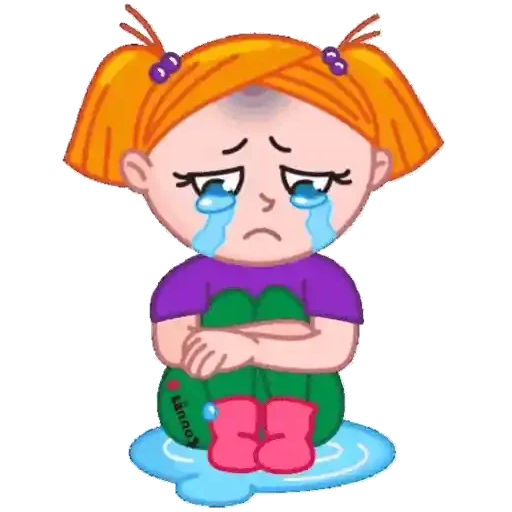 Menina de cabelo laranja com pigtails, chorando com lágrimas azuis, vestida com uma camisa roxa e calça verde, sentada em uma poça de água.