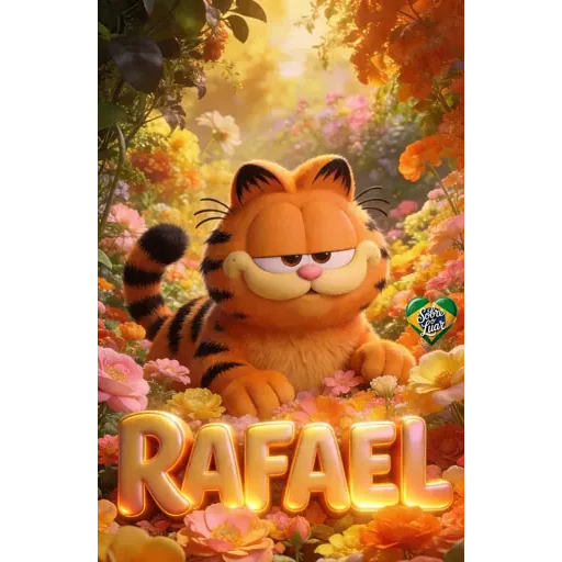 Gato laranja com listras pretas em meio a flores coloridas, com o nome 'RAFAEL' em letras douradas.