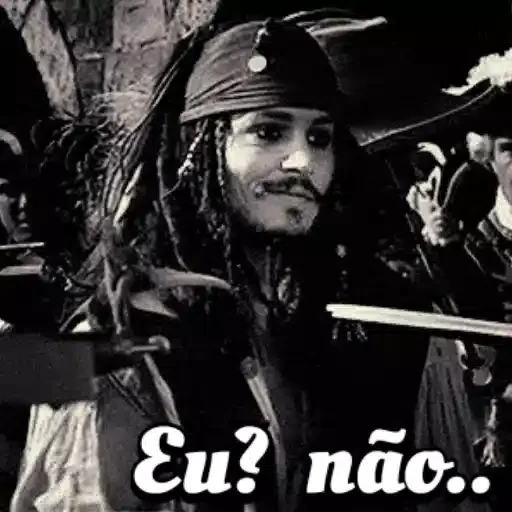 Imagem em preto e branco de Johnny Depp como Capitão Jack Sparrow, com dreadlocks e chapéu de pirata, dizendo 'Eu? não..'