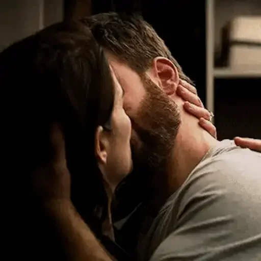 Um casal se beijando, com a mão de uma das pessoas no rosto do outro. O homem tem barba e usa uma camisa cinza.