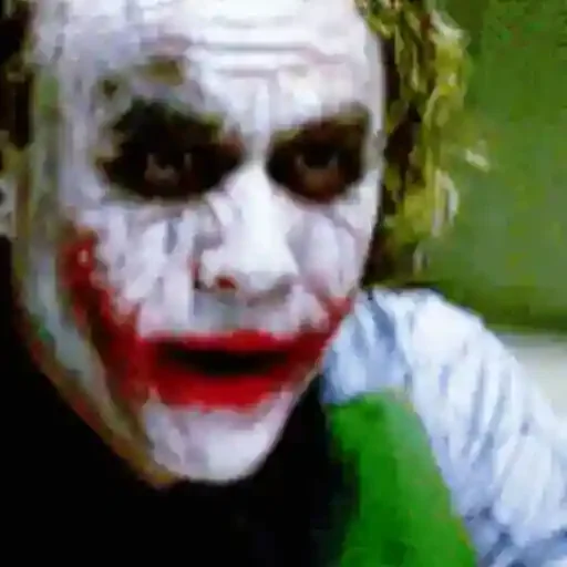 O Coringa, interpretado por Heath Ledger, com maquiagem branca no rosto, olhos escuros e sorriso vermelho.