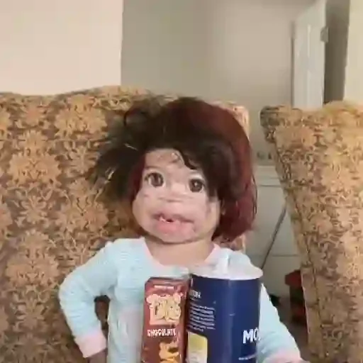 Menina com expressão surpresa, segurando uma caixa de cereal e um copo, sentada em um sofá.