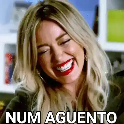 Uma mulher loira com sorriso largo e olhos fechados, lábios vermelhos, fundo desfocado. 'NUM AGUENTO'