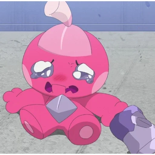 Um personagem de anime rosa, parecido com um boneco, com expressão de tristeza ou surpresa, sentado no chão com um objeto na mão.