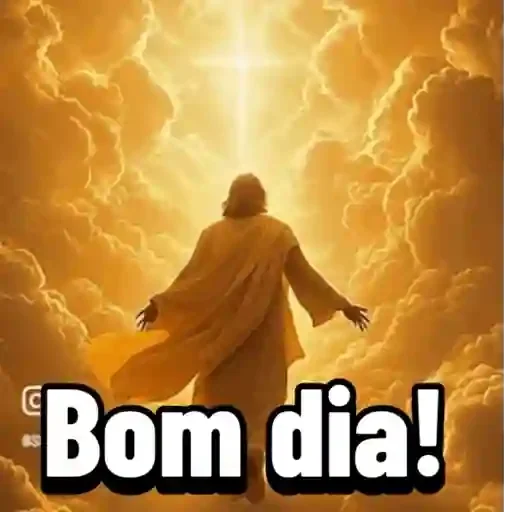 Figura de uma pessoa com os braços abertos em meio a nuvens e um grande brilho, com o texto 'Bom dia!' na parte inferior.