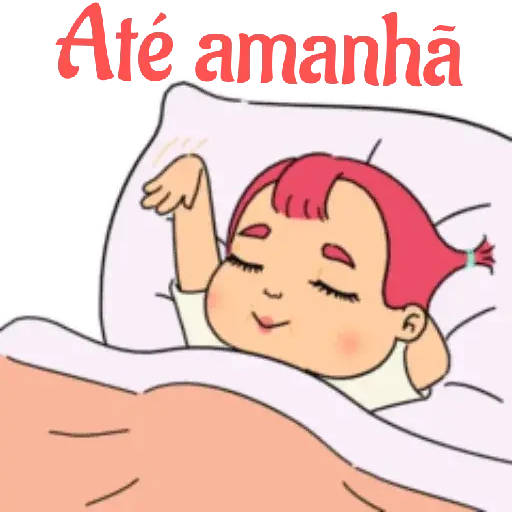 Menina de cabelos rosa deitada na cama com um travesseiro, sorrindo e com os olhos fechados. Há a inscrição 'Até amanhã' em vermelho.