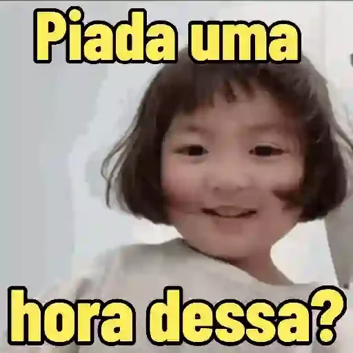 Menina com cabelo curto e expressão curiosa, com texto 'Piada uma hora dessa?' em amarelo.