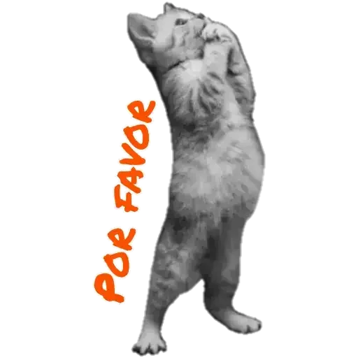 Um cachorro cinza em pé sobre as patas traseiras, com as dianteiras levantadas, olhando para cima. Ao lado, está escrito 'POR FAVOR' em laranja.