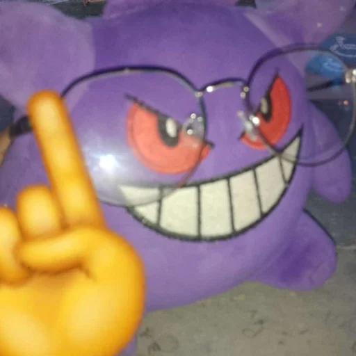 Um Gengar do Pokémon com óculos e um dedo indicador levantado, com olhos vermelhos e um sorriso grande.