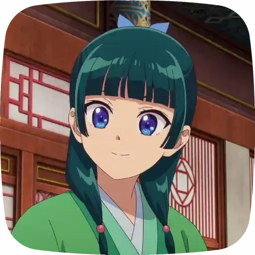 Garota de anime com cabelos pretos e olhos roxos, vestindo um quimono verde, em frente a uma construção com detalhes em vermelho e branco.