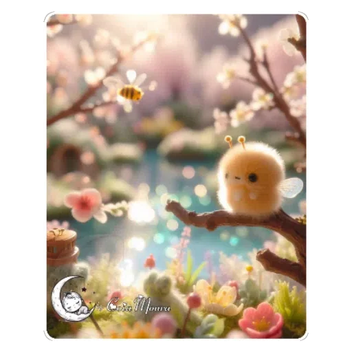 Um pequeno personagem de pelúcia amarelo com expressão feliz está sentado em um galho de árvore em um cenário floral com flores cor-de-rosa e um lago ao fundo. Há uma abelha voando perto.