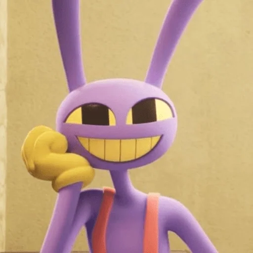 Um personagem de desenho animado com corpo roxo, orelhas de coelho e um sorriso largo, mostrando os dentes. Ele tem uma mão levantada perto do rosto.