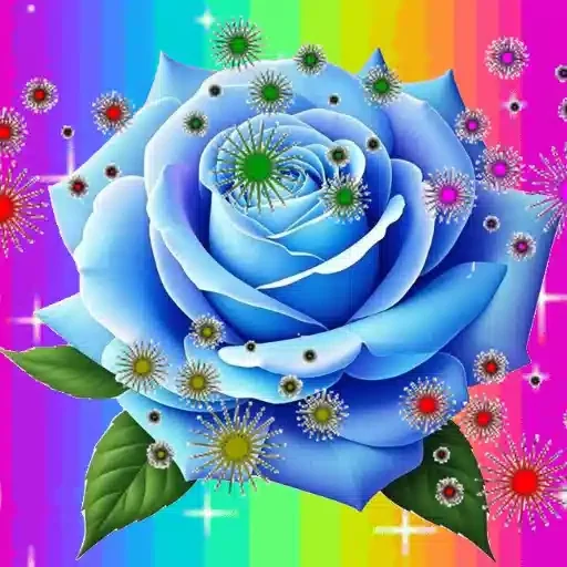 Uma rosa azul com folhas verdes em um fundo arco-íris, decorada com pequenas flores e faíscas.