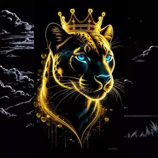 Um tigre preto com olhos azuis brilhantes e uma coroa dourada sobre a cabeça, com detalhes em ouro e um fundo preto com nuvens brancas.