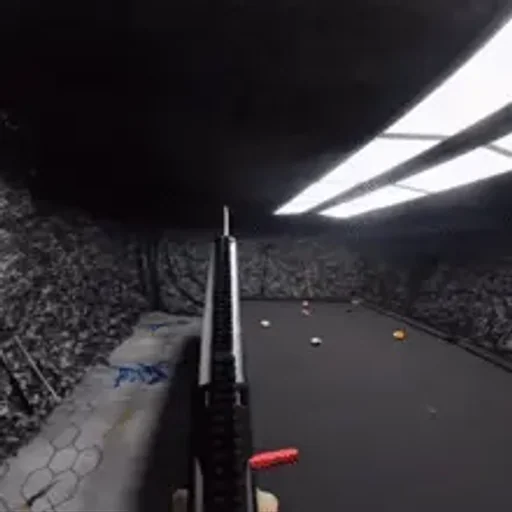Uma cena de um jogo de bilhar ou sinuca, com tacos e bolas em uma mesa preta em um ambiente com paredes de pedra e iluminação fluorescente.