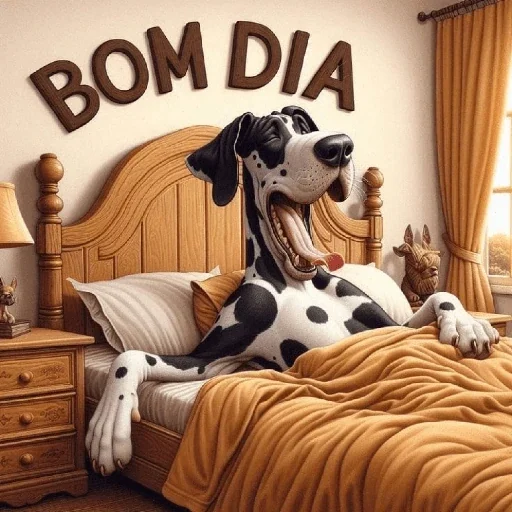 Um cachorro Dalmatário sentado na cama, com a língua para fora e expressão alegre, em um quarto com cortinas e móveis de madeira. A imagem traz 'BOM DIA' em letras grandes.