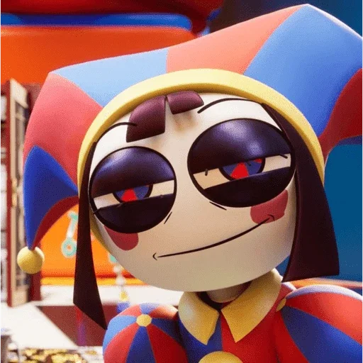 Personagem de desenho animado com chapéu e roupa coloridos, parecendo um palhaço ou personagem de circo, com expressão facial relaxada e olhos semicerrados.