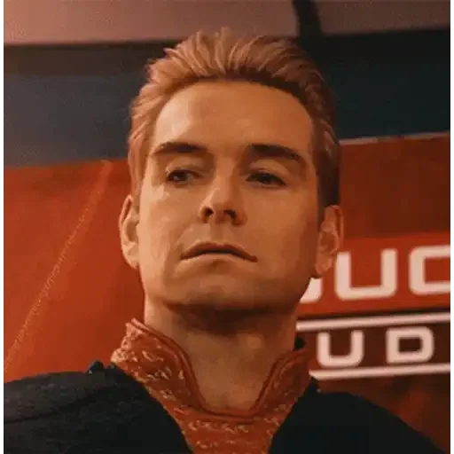 Rosto de um homem com cabelo loiro curto e expressão séria, vestindo um casaco preto sobre uma camisa laranja, com um fundo laranja e letras brancas desfocadas.