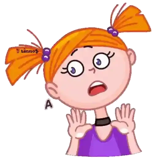 Menina de cabelo laranja em coque duplo com expressão surpresa, vestindo uma blusa roxa e com as mãos levantadas.