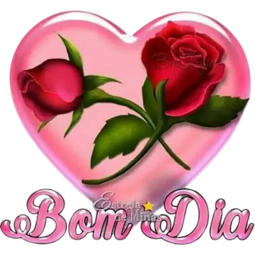 Um coração rosa com duas rosas vermelhas e a frase 'Bom Dia' em letras rosadas.
