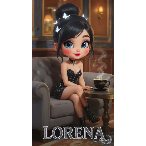 Uma garota de anime sentada no sofá com um bule de café fumegante, vestindo um vestido preto. Ela tem o cabelo preto com presilhas brancas e o nome 'Lorena' aparece na parte inferior.
