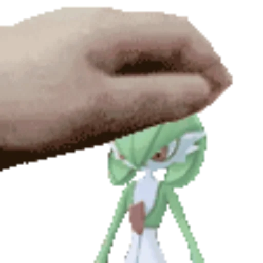 Uma mão gigante cobre a cabeça de um pokémon verde e branco, com olhos castanhos, parecendo uma reação de surpresa ou susto.