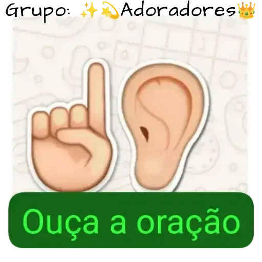 Uma mão com o dedo indicador levantado e uma orelha lado a lado, com a frase 'Ouç a oração' em um retângulo verde abaixo. O texto 'Grupo: Adoradores' aparece no topo com emojis.
