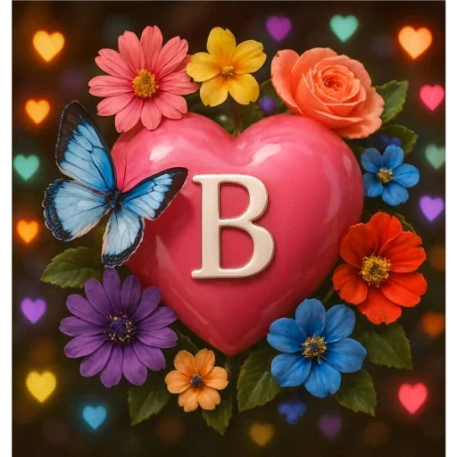 Um coração rosa grande com a letra 'B' no centro, rodeado de flores coloridas e um borboleta azul, com corações pequenos ao fundo.