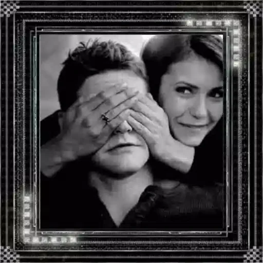 Um casal em preto e branco, com a mulher cobrindo os olhos do homem com as mãos. Ela usa um anel em uma das mãos e ambos estão enquadrados por uma moldura decorativa.