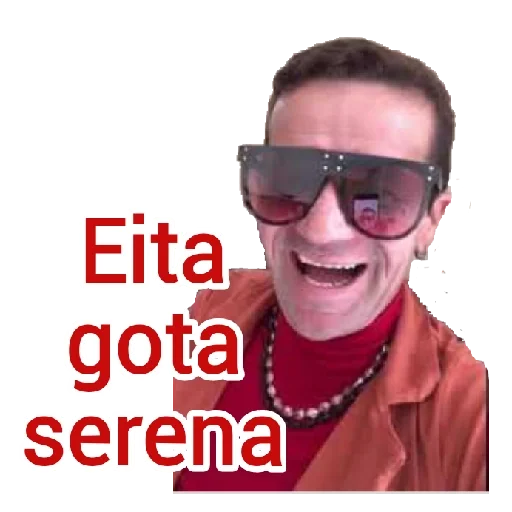 Um homem com óculos de sol e um casaco laranja, com o texto "Eita gota serena" ao lado.