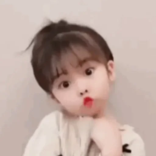 Menina com expressão fofa, fazendo careta com a língua para fora e mão no queixo, vestindo uma blusa branca.