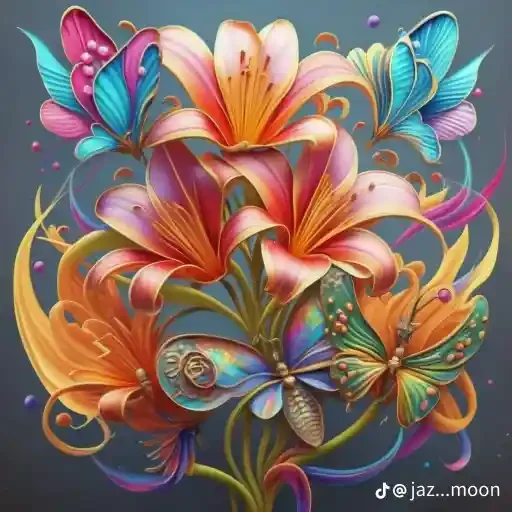 Rosto de mulher com cabelo rosa e borboletas azuis, amarelas e roxas, flores e estrelas no fundo escuro com lua…