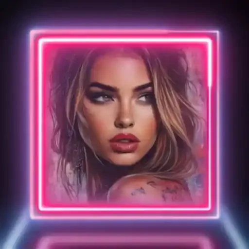 Rosto de uma mulher com maquiagem pesada e cabelos castanhos, dentro de um quadro rosa neon.