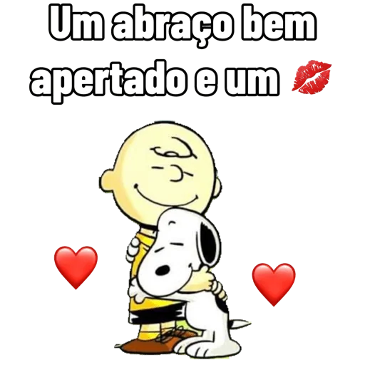 Um abraço apertado com um beijo. Charlie Brown e Snoopy com dois corações vermelhos.