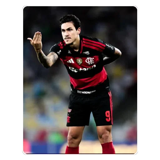 Jogador de futebol com camisa do Flamengo, marca BRL e HAVAN, com expressão de comemoração.