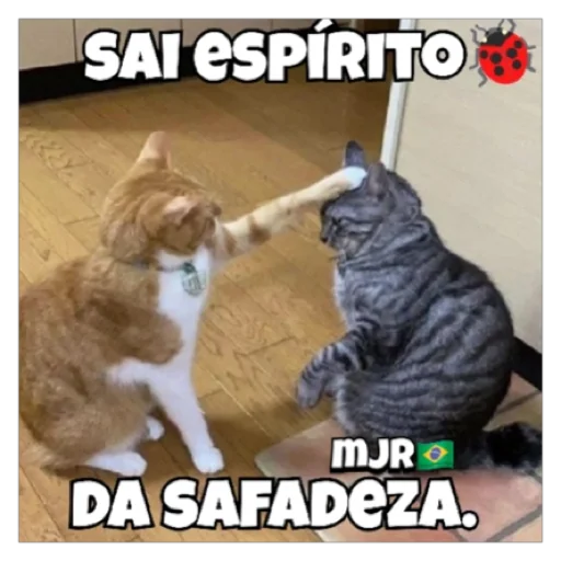 Dois gatos, um laranja e branco e outro cinza, estão sentados no chão, com o gato laranja segurando um osso na boca e apontando para o outro gato. A imagem tem o texto 'SAI ESPÍRITO DA SAFADEZA' e uma pequena ladybug vermelha no canto superior direito.