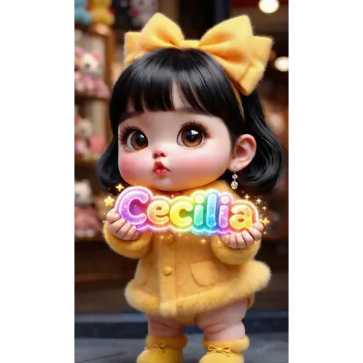 Menina de cabelo preto com franja e um laço amarelo na cabeça, vestindo um casaco e meias amarelas, segura uma placa colorida com o nome Cecília.