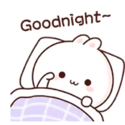 Um ursinho de pelúcia deitado na cama com um cobertor roxo, sorrindo e com as bochechas rosadas, e a palavra 'Goodnight~' escrita acima.